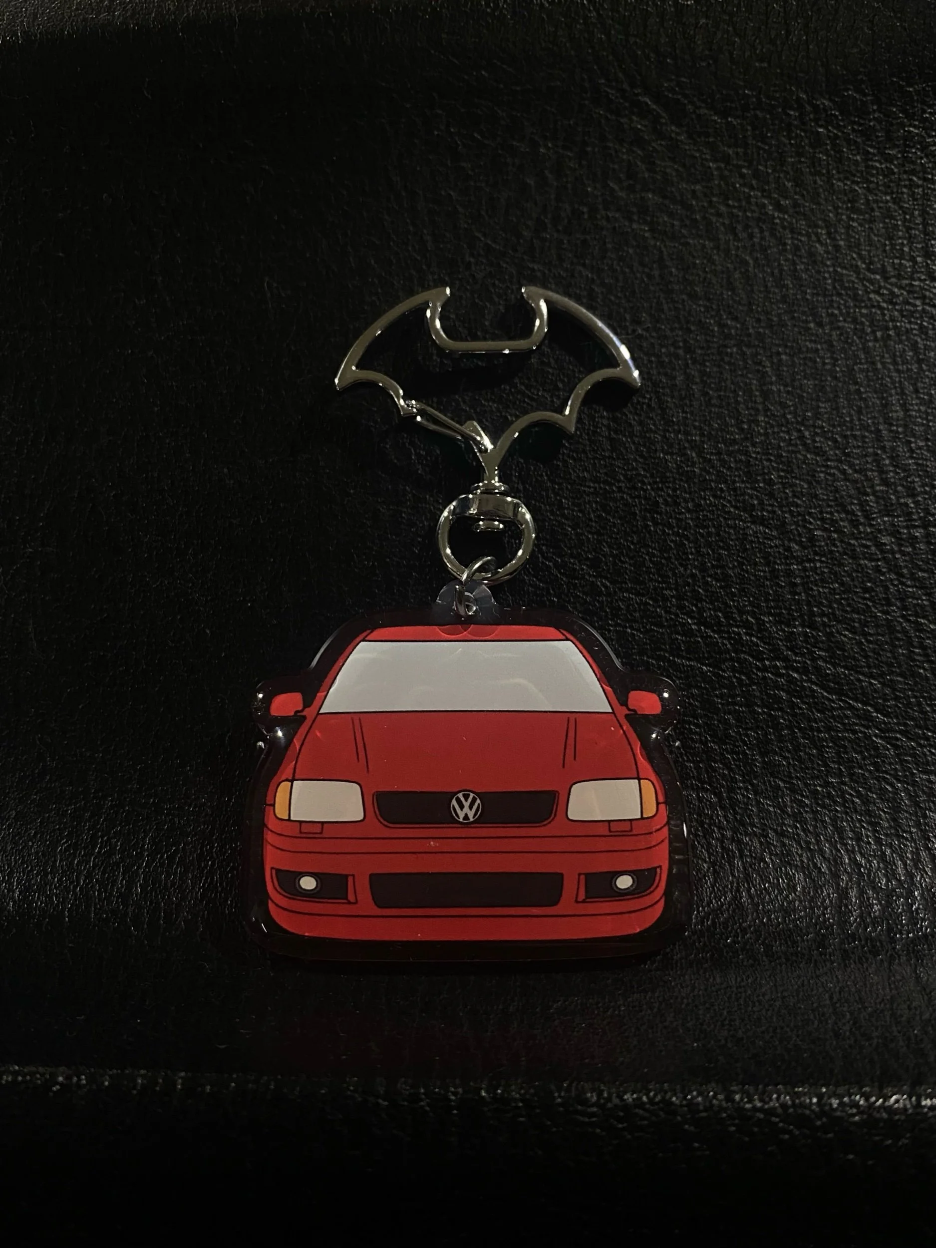 Volkswagen Polo 6N2 red acrylic keychain topped with clear epoxy. High-quality car keyring with sharp detail and a durable finish. Designed for enthusiasts who want a clean, long-lasting accessory.